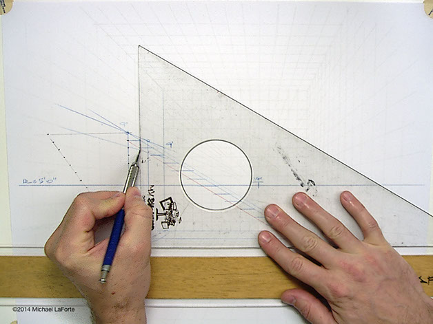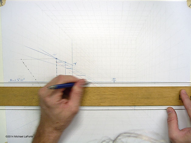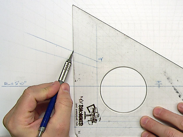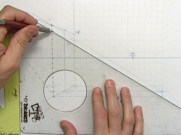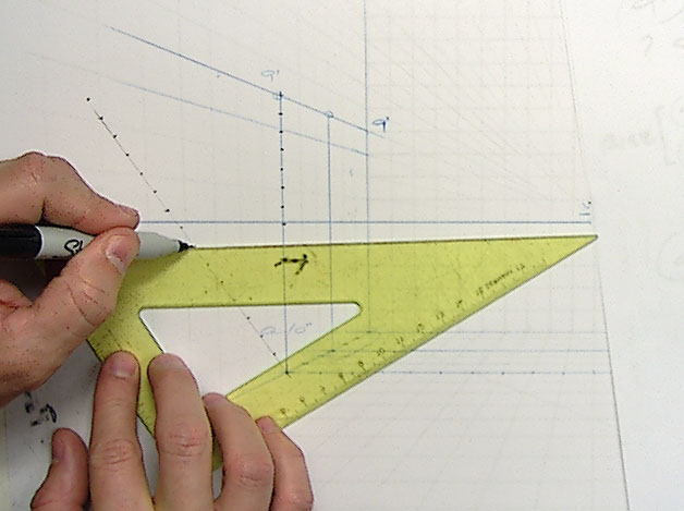Sliding the triangle parallel, carry the increments from the angled line over to the vertical plumb line.