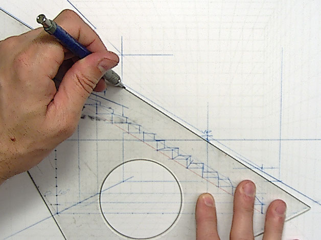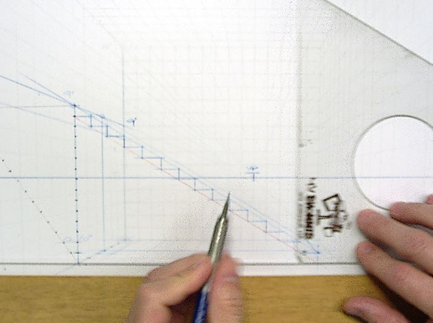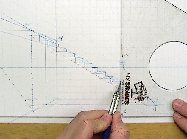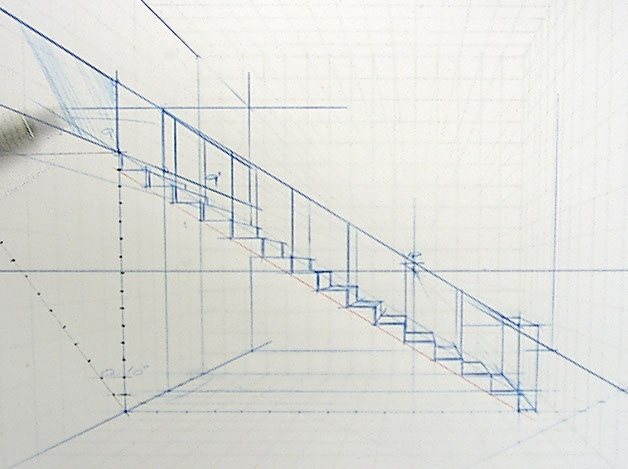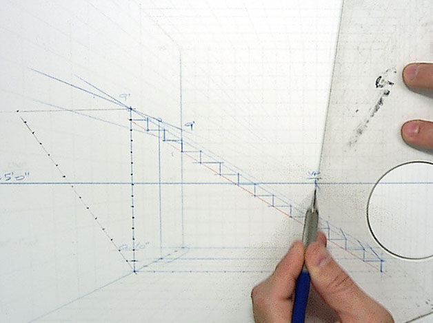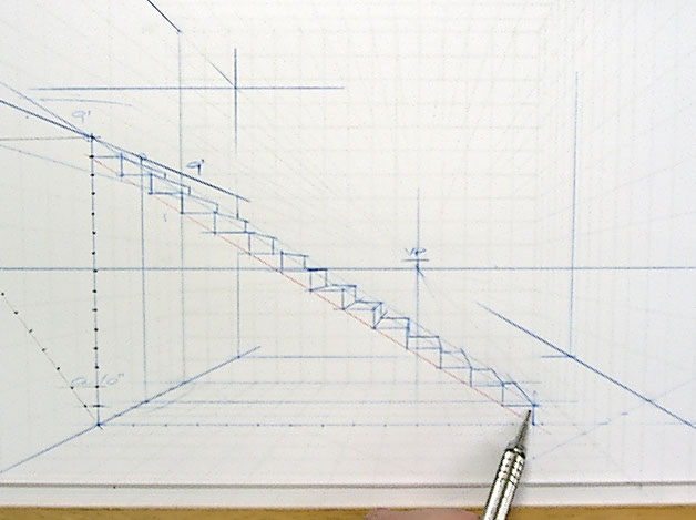 Where the vertical risers and horizontal treads meet the top slope control line, carry the corners toward the VP, crossing the far slope line (which is parallel to the forward one).