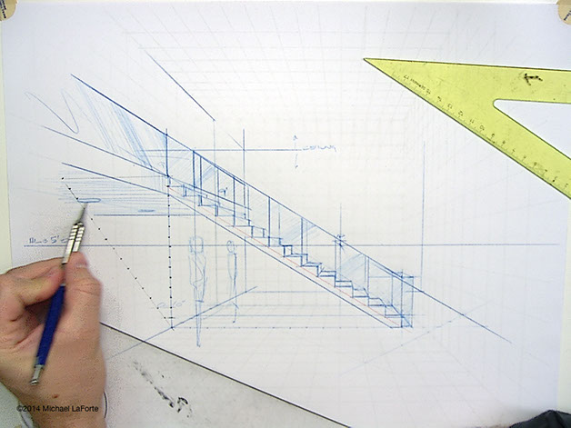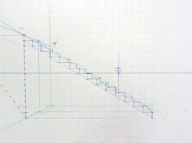 Notice that in this scenario, the slope of the stair case is NOT converging to a slope VP. The slope control lines are all simply parallel between the first step and the second floor level.