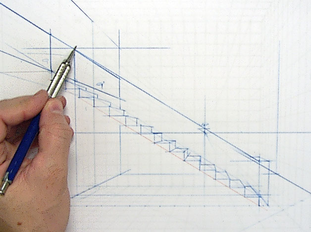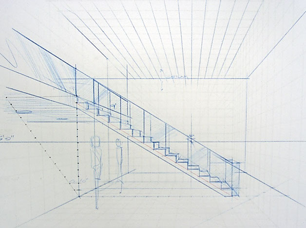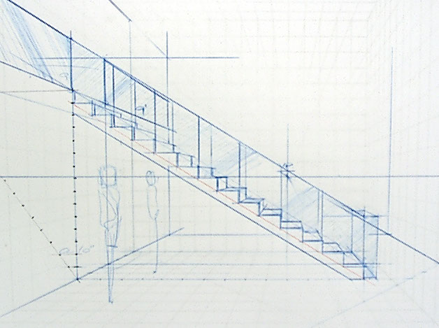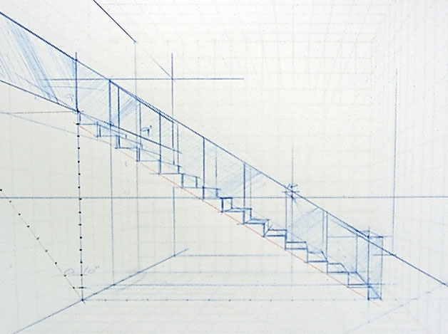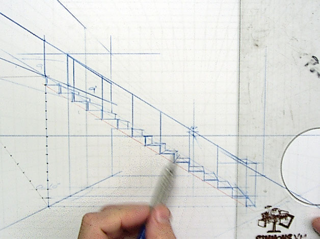 When the stairs are coming down from above, we can use the same system, except the stairs will now have a slope VP BELOW the HL of the 1-PT VP.