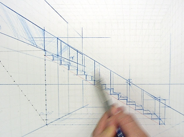 In this example below, this is actually a 2-PT perspective with a very far distant right VP, and strong concentration toward the center VP and is constructed as if we're on the second floor level, about a 15' HL or Eye Level