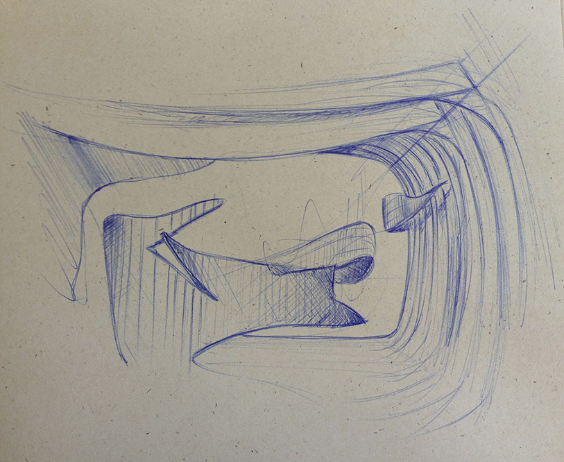 Often times students new to this process have a difficult time finding forms in their scribbles. Try this exercise. I have hundreds of these littered throughout my sketchbooks. They provide a relaxing way to unwind and not feel pressured to design anything in particular. I find them to be somewhat meditative.