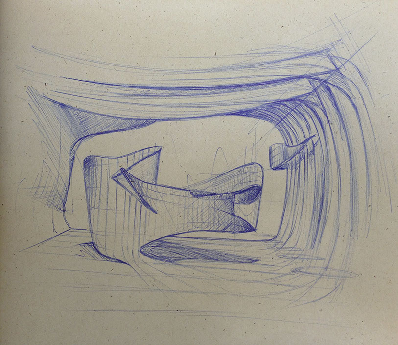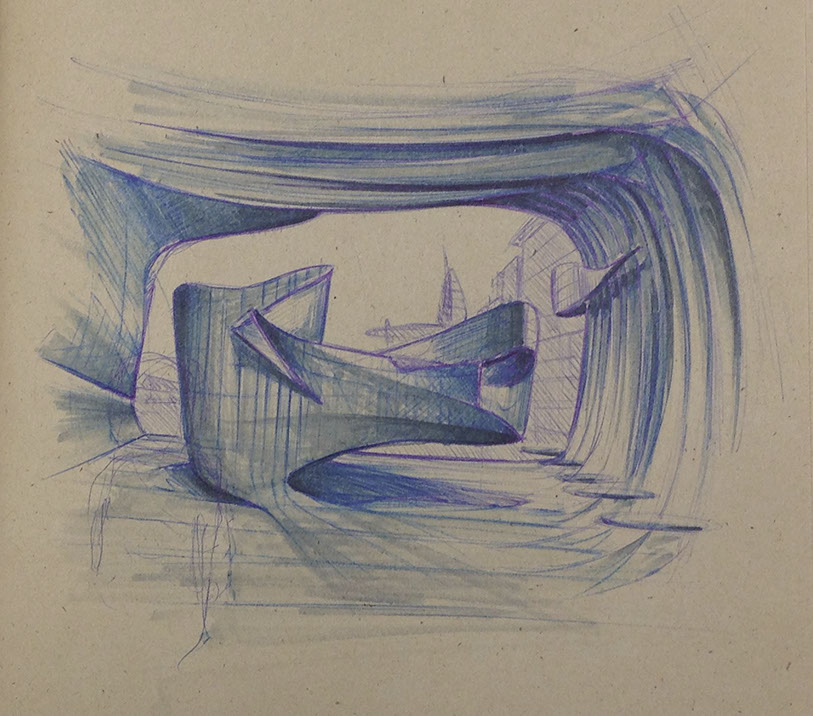 This scribble began with a graphite line and went from a small object to a small pavilion by simply adding rough people for scale.