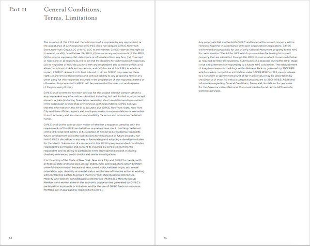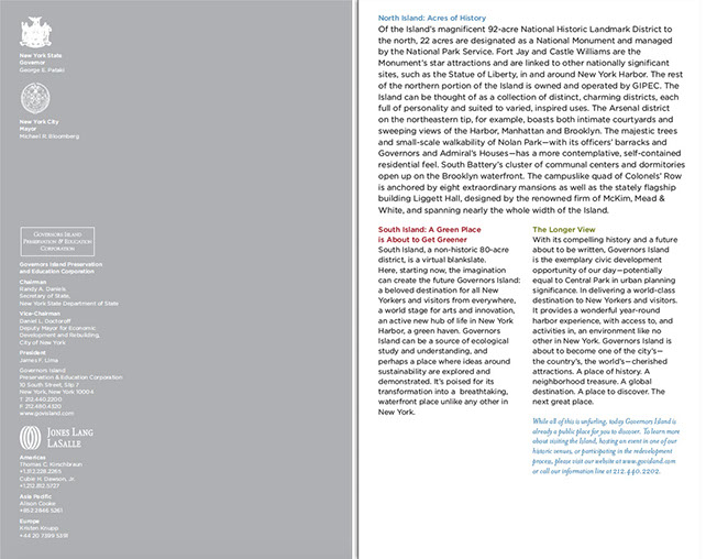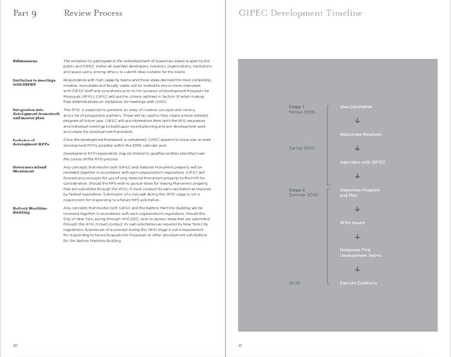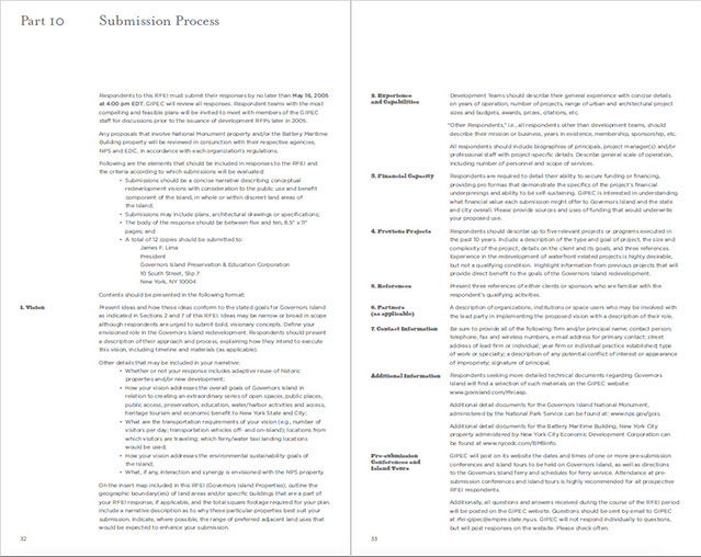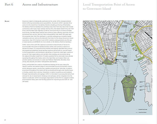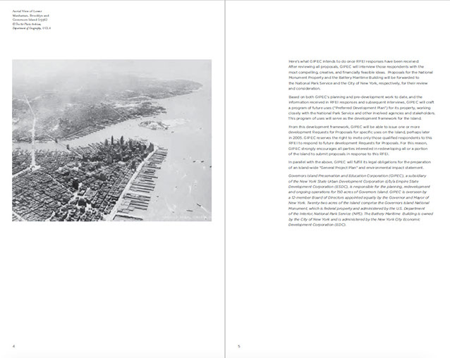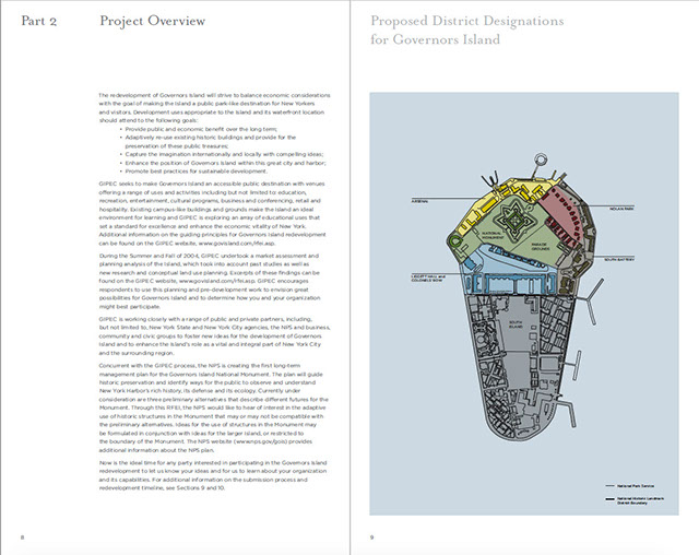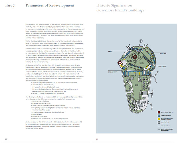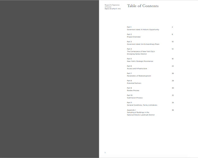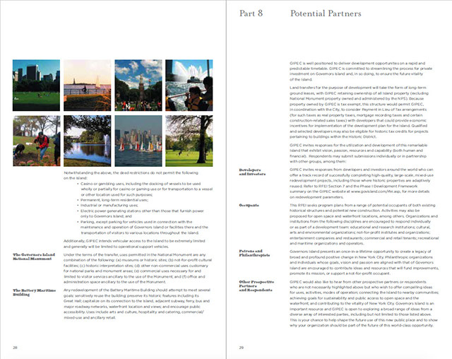 Page 1. TOCPages 2-3. Part 2: Governor's Island: A Historic OpportunityPages 4-5. Part 2 continuedPages 6-7Pages 8-9. Part 2: Project OverviewPages 10-11. Part 3: An Extraordinary PlacePages 12-13. Part 3 continuedPages 14-15. Part 4: The Centerpiece of NYC's...Pages 16-17. Part 4: Emerging NY Harbor DistrictPages 18-19. Part 5: NY's Strategic ProminencePages 20-21Pages 22-23. Part 6: Access and InfrastructurePages 24-25. Part 6: Regional Transportation, Pts of AccessPages 26-27. Part 7: Parameters of RedevelopmentPages 28-29. Part 8: Potential PartnersPages 30-31. Part 9: Review ProcessPages 32-33. Part 10: Submission ProcessPages 34-35. Part 11: Terms and ConditionsPages 36-37. Appendix I: BuildingsPages 38-39. Appendix I: Buildings2Pages 40. End page program credits with jacket overleaf10 - 21<>