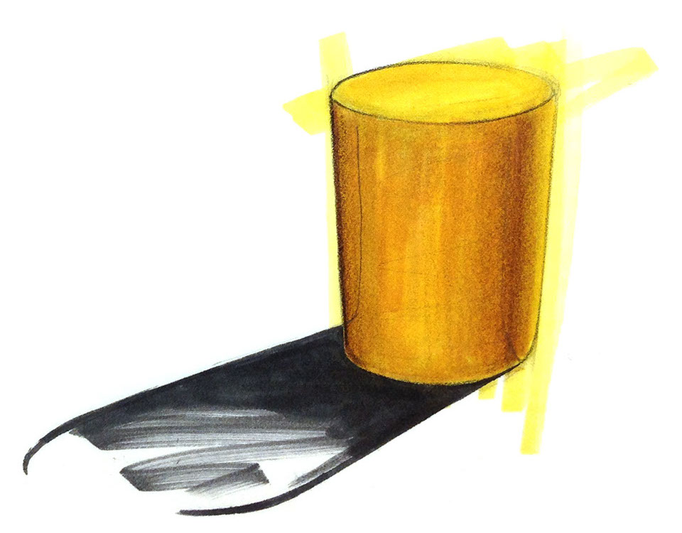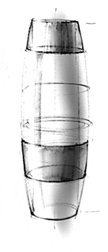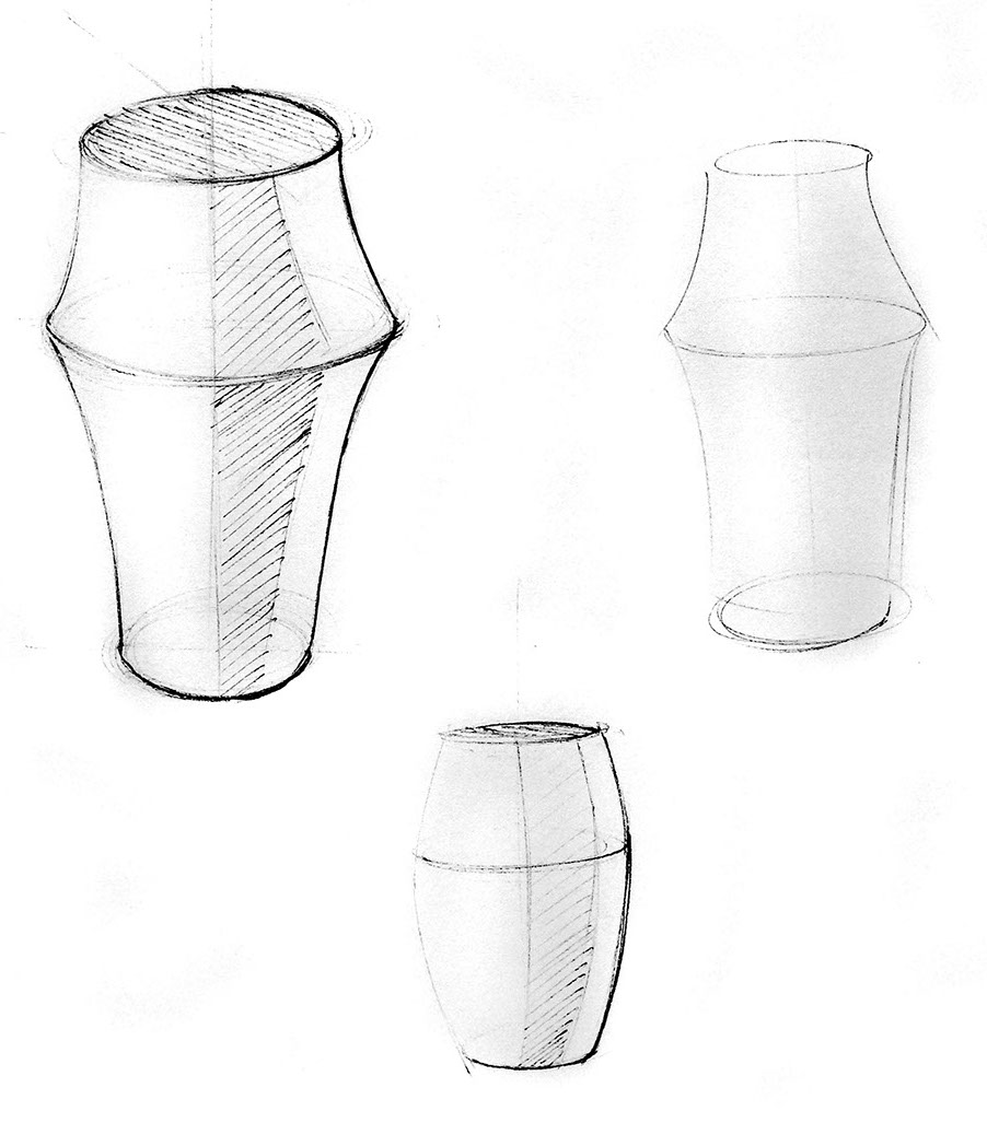 Vertical cylinders are the easiest to begin with. Once you have a good grasp of ellipses in the horizontal plane begin working on well constructed vertical and symmetrical cylinders. Once you have symmetry mastered, then move on to more complex variations such as transitional forms or skewed vases.