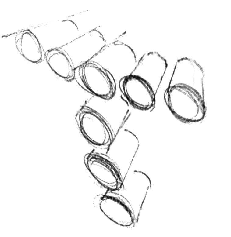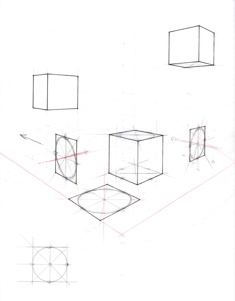 Well proportioned cubes are an absolute must as a circle in perspective will need to accurately fit into a square plane of the cube. You will need to be able to accurately locate the center axis and the four cardinal tangents where the circle will meet the square. Practice this for warming up, before moving on to cylinders.