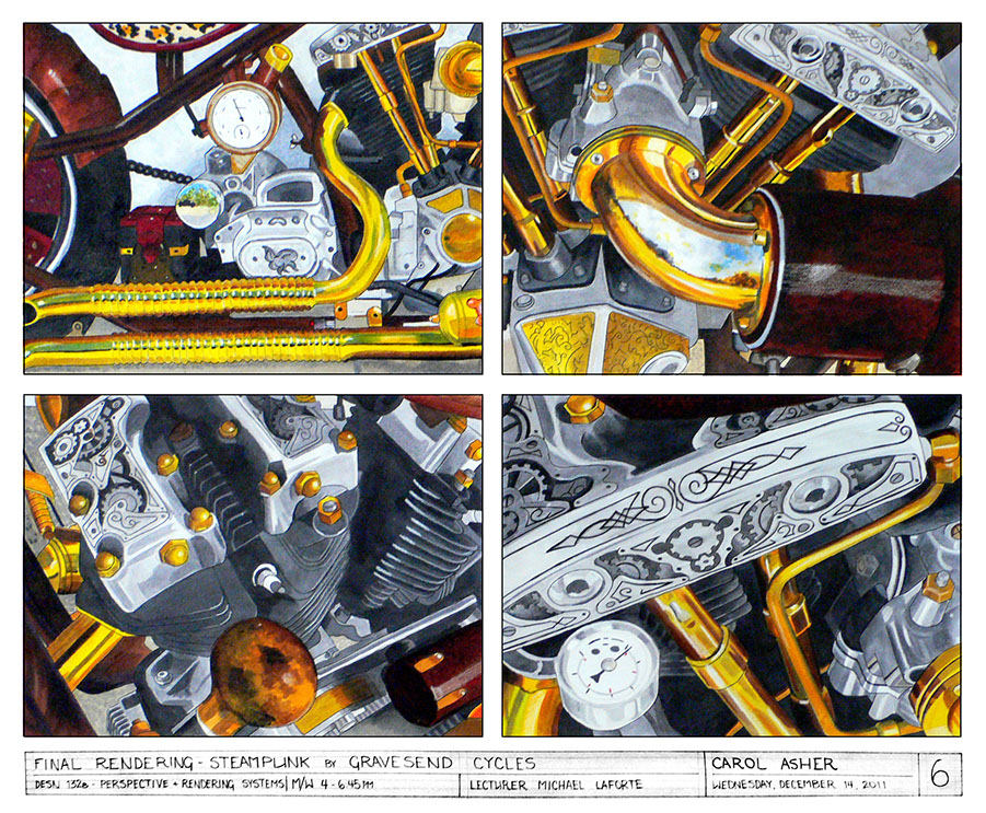 Start rendering studies early as well. Don't wait do your final piece to start exploring surface and light logic in color. I like to render into my graphite line work, on Marker Paper, then, as the rendering develops, begin working in stronger line depth with ink pens and/or black Prismacolor Pencil.