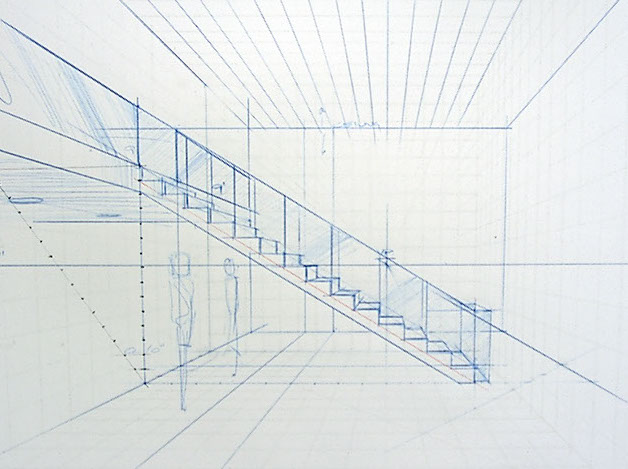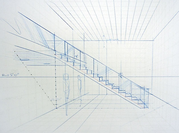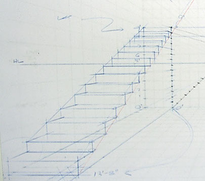 When the stairs are coming down from above, we can use the same system, except the stairs will now have a slope VP BELOW the HL of the 1-PT VP.