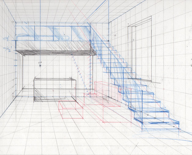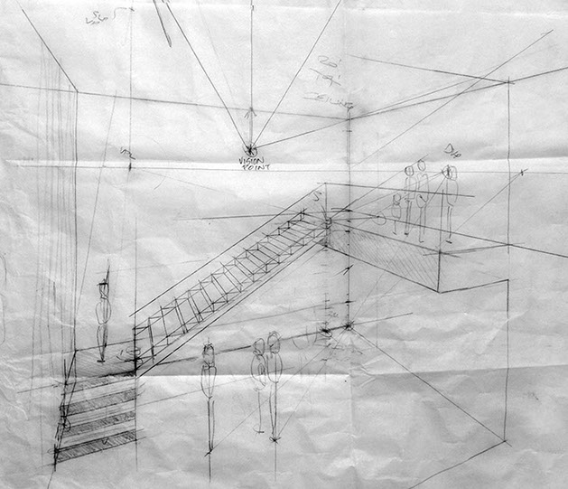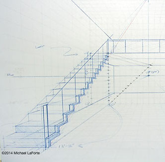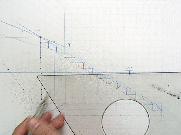Notice that in this scenario, the slope of the stair case is NOT converging to a slope VP. The slope control lines are all simply parallel between the first step and the second floor level.
