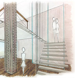 A little shading helps to identify the glass planes. Designing with glass handrails is not only modern and minimalist, but is easily achieved just from the line work. As you can see in the photo above, we mostly observe glass from its edges, not the plane. The plane of glass catches reflections. Refer to Mirror Reflections & Chrome Logic and Glass Rendering for more guidance.