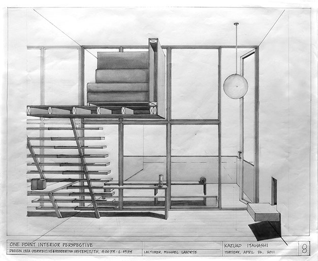 In this example below, this is actually a 2-PT perspective with a very far distant right VP, and strong concentration toward the center VP and is constructed as if we're on the second floor level, about a 15' HL or Eye Level