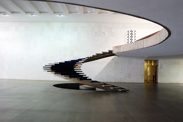 We often come across images like this of beautiful and minimalist stairs with no handrails such as this Circular staircase at Brasilia by Oscar Niemeyer, however we simply can't build stairs without handrails due to public safety.