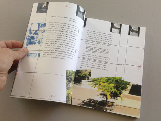 This thesis installation project investigated negative—sites un-assigned or unoccupied of discernible activity—spaces and examined modes of re-appropriation in a re-territorialing action. A field manual (below) was designed and modeled after Thomas Guides as a re-consideration of representing architectural construction documents. Advisor: Jeffrey Inaba